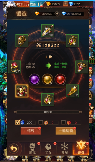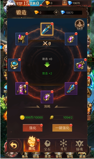锻造系统是围绕着装备系统升级强化的一个培养系统,包括了强化、宝石、升星、铸魂。锻造系统可以大大提升玩家的战斗力。