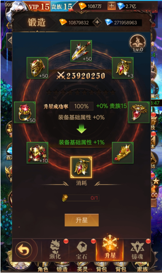 升星,通过消耗升星石对角色身上的装备进行升星,大幅度提升装备属性。