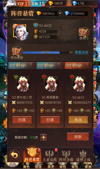 竞技系统是游戏内的主要对抗系统,鼓励玩家之间相互竞争、勇争上游,提升自身的战斗力,对抗方式包括阵营悬赏、王者竞技、阵营争霸、诸神之战、争夺领袖。玩法包括阵营之间以及阵营内的对抗、跨服对抗、多人对抗等。