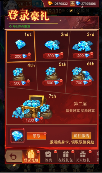 福利系统是游戏给予玩家免费福利的系统,福利方式包括登陆豪礼、签到、在线礼包、邀请码等。