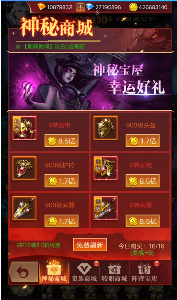 商城系统是游戏为了玩家获得更好的体检加入的功能,商城包括神秘商城和贵族商城、转职商城。玩家可以通过购买礼包迅速地提升战斗力或者获得更帅气的角色造型。