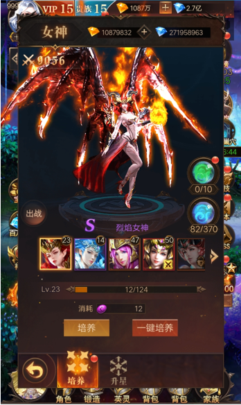女神激活后可设置女神出战,跟随角色一起战斗,每个女神都可进行培养,培养可增加女神属性,获得相同的女神可升星提升属性,女神可在战斗中给角色进行治疗