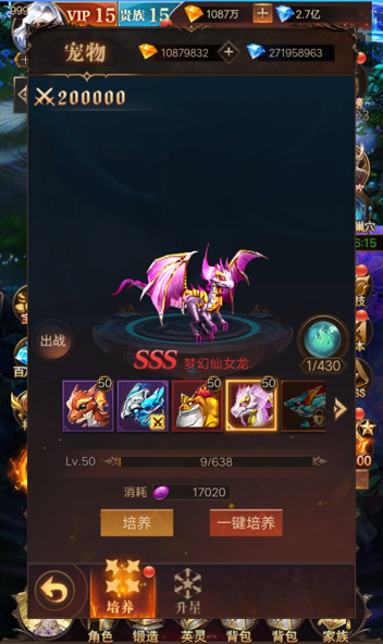 宠物激活后可设置宠物出战,跟随角色一起战斗,每个宠物都可进行培养,培养可增加宠物属性,获得相同的宠物可升星提升属性,宠物在战斗中可释放魔法造成多倍伤害