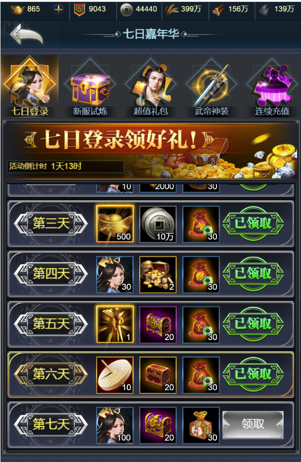 “七日嘉年华”里第一个,也是最简单的活动便是“七日登录”。主公大人只需要在七天内,每天登录一次,再可以达成当天奖励的领取条件。