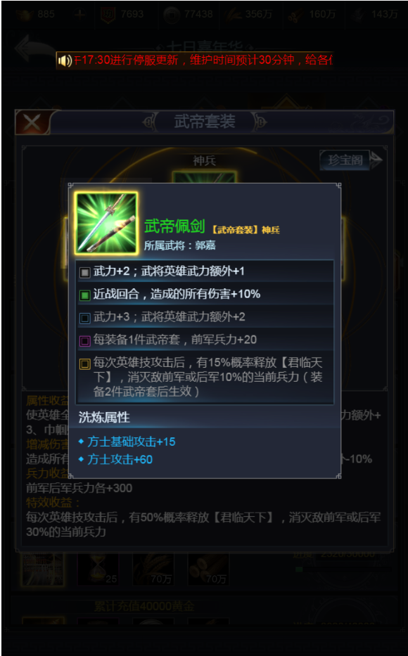 在“七日嘉年华”的活动中里为主公准备了超强力帝王套装——武帝神装!主公可以通过累积充值获得整套的武帝神装,激活专属超强技能“君临天下”!
