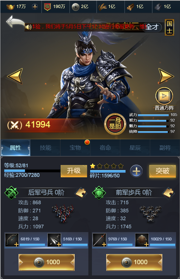 阵法的升级与进阶需要战旗和心得,这两个道具都可以通过游戏内的玩法获得。为了早日让自己的武将成为“魁首”般强大的武将,各位主公一定要努力获取更多的战旗和心得啊!