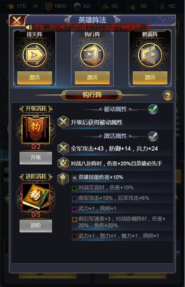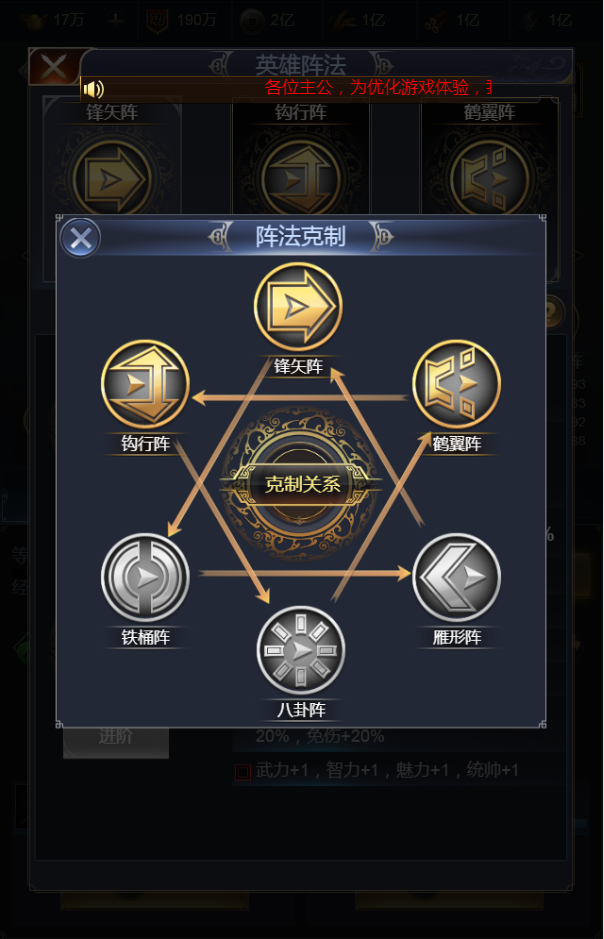 除了存在克制关系,每个阵法都会直接为武将提供属性。这里要提醒各位主公,切勿忘了点击激活,否则阵法的选择无法生效。
