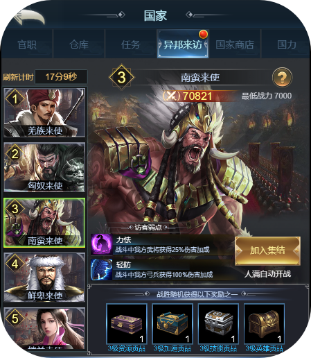 异邦来使为国家副本玩法,只有同一国家的主公才可以同时迎战本国的异邦来使。迎战胜利,可获得丰厚的贡品奖励。