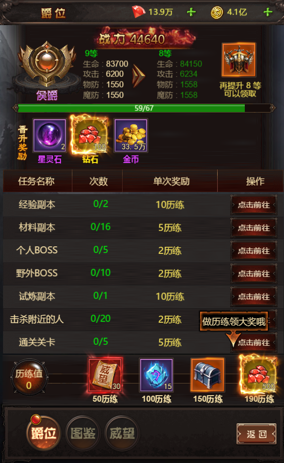 历练值的提升除了可以提升爵位,更换爵位印记之外。每日根据历练值可获取一定材料奖励,最高档的奖励是500钻石,也就是游戏每日免费赠送500钻石!日积月累,重要的道具都能买买买买!
