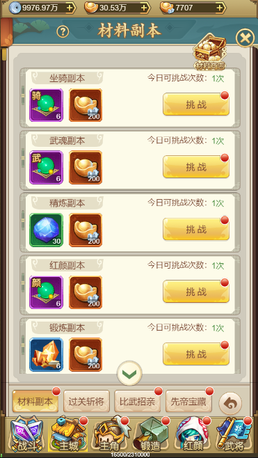 随着玩家等级的提升,会逐步开启不同的材料副本,每个材料副本每天可以免费挑战一次,挑战成功后可以获得大量绑元以及对应的进阶材料。每天挑战成功后每个副本还有一次消耗元宝的扫荡次数,随着VIP等级的提升,可获得更多的元宝扫荡次数。