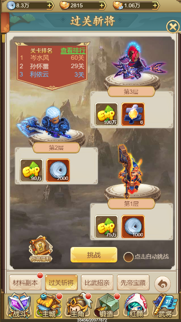 过关斩将是爬塔型的副本通关玩法,由第1层往上进行挑战,挑战胜利后可获得大量经验以及金装碎片。金装碎片可以在斩将福利中兑换各种道具,以及在金装商店中兑换极品金装装备,助角色战力飙升。