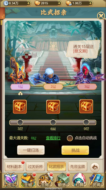 比武招亲同样是由低层往高层挑战的爬塔闯关型副本,挑战胜利后可以获得大量红颜进阶材料。每通关到一定层数之后,可以领取对应的通关宝箱奖励,内含大量银两与红颜进阶材料,而当通关到更高层数后,还会赠送超高战斗力的极品红颜。