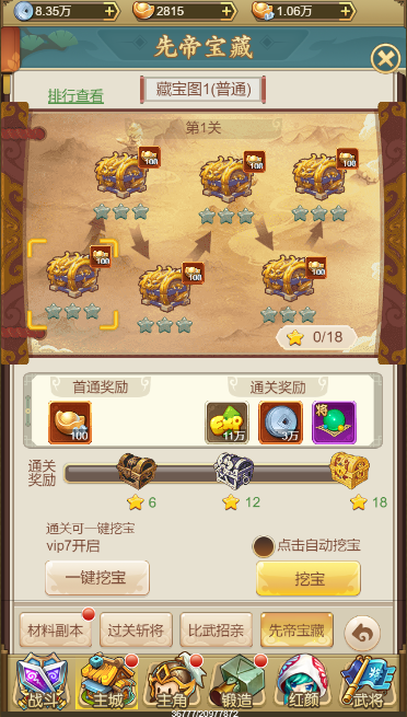 先帝宝藏每一大关拥有6个小关卡,每通关一个小关卡可以获得经验、银两、武将进阶材料,首次通关更可获得绑元奖励,当小关卡均通过后便可进入下一大关。每通关一个小关卡,还会根据战斗时间的长短获得对应数量的星星,最高三星,累计一定数量的星星,可开启关卡宝箱奖励。