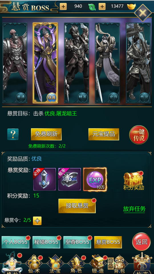 2、悬赏BOSS分为普通、优良、精英、史诗和传说5种品质,分别对应绿、蓝、紫、橙和红5种品质的装备。,