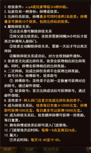 1、在玩法-门派-师徒页面,左上角页面有详细的收徒介绍及解除师徒关系介绍