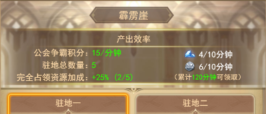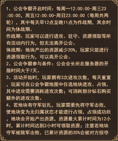 二、公会争霸需要派出两支队伍进行地盘抢夺,建议占领大本营(7个空位)或者高级城镇(5个空位),奖励更丰富,低级城市,草地不推荐占领,注意未占领地盘才可以进行队伍英雄人员挑战,已经占领地方无法进行英雄人员挑战,在公会争霸期间无法退出公会,管理也无法踢人,在休战期11点以后可以退出公会,管理也可以踢人,小技巧:每个地盘都有空位,不管是否同一公会,只要位置全部占满就有完全占领的额外资源占领加成,推荐大家尽量占领人多的高级地盘,公会争霸是每天晚上11点进行休战,无法进攻其他人,也无法占领地盘,如果被敌对玩家卡住时间11点将地盘夺走,会损失一晚上的资源,占领地盘有10分钟的驻扎期,驻扎结束以后会有30分钟的保护期,这段时间其他人是无法进攻你的地盘的,所以我们可以卡时间,将30分钟的保护期卡在11点,这样可以避免被敌对玩家抢夺地盘,减少损失,可以主动放弃已经占领的地盘,有1小时的冷却时间,后面重新占领,或者和自己公会的人互换地盘,这样可以不用等1小时地盘占领冷却时间