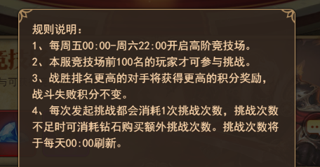 一、高阶竞技场开服第4天就会开启,每周五开启,每周六22点结束,23点发放奖励