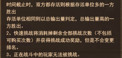 小技巧:由于高阶竞技场是每周六22点结束,所以我们可以卡住结算时间,星期天的11次数尽量在晚上20点40分-22点打完,不然可能会太早打完分数不够被后来者反超,从而没有拿到好名次失去了奖励,因为正在战斗中的玩家无法被挑战,所以我们预留多一点时间给自己挑战,以免到了22点次数还没用完