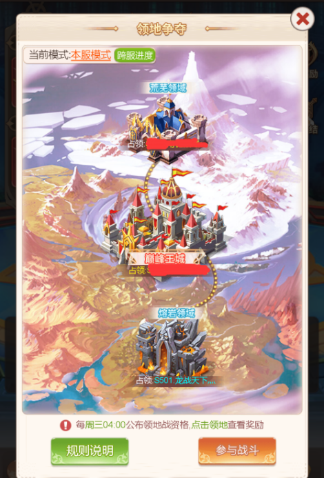 一个公会是一个集体,而公会争霸活动则是考验一个集体团结的最好时机。该活动于开服第四天及之后的每周三开启,第一次公会争霸根据公会总体战力的排行,分为2场领地争夺,共有4个公会参与,取公会排名战力最高的4个公会为参赛公会。