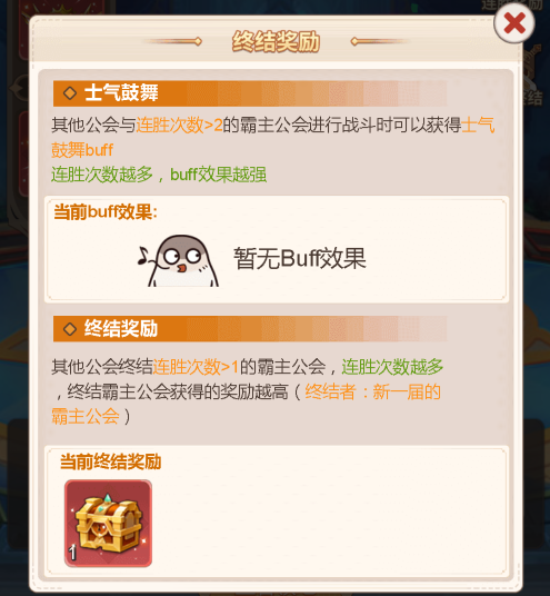 如果一个公会连胜了很多次,为了避免出现王城被大公会垄断的局面,在公会决赛时,对与其进行决赛的队伍是有士气鼓舞BUFF加成的,且巅峰王城公会连胜次数越多,BUFF效果越强。