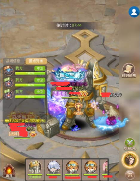 玩法心得:在副本倒计时结束前,占领王者据点的公会将会取得胜利,要想占领王者据点,必须先占领至少一座普通据点,是非常考验公会成员之间的配合的,小编经常就因为打王者据点打到一半,被敌对公会的大佬偷袭普通据点导致抢夺功亏一篑,非常郁闷。后面经过敌对公会的毒打后,终于明白最容易抢夺据点的方法啦,其实就是开场先抢夺己方据点,高战分两批,一批抢夺敌对公会普通据点,另外一批在王者据点以及己方据点进行拉扯游击,自从小编学会这种方法,公会到现在已经连胜了4次了,希望大家也能学习到抢夺王城的经验。