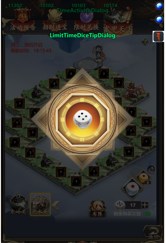 1、活动期间玩家通过投掷骰子来获得点数去控制角色移动步数,前往指定的格子上便能获得玩法道具(临时道具,只在此玩法有效)或挑战守将。